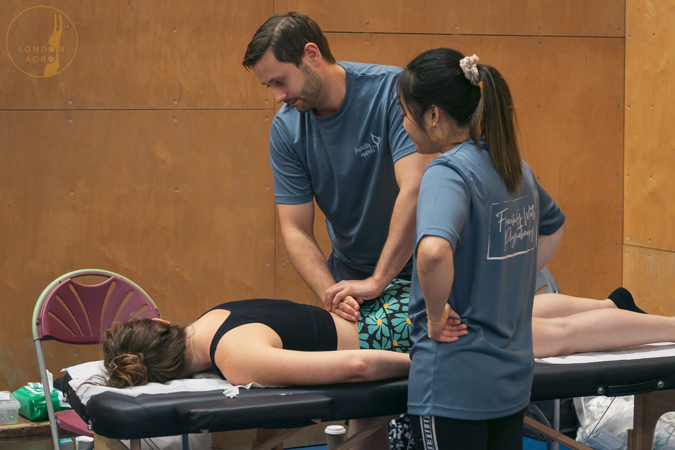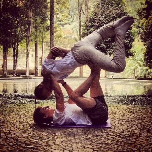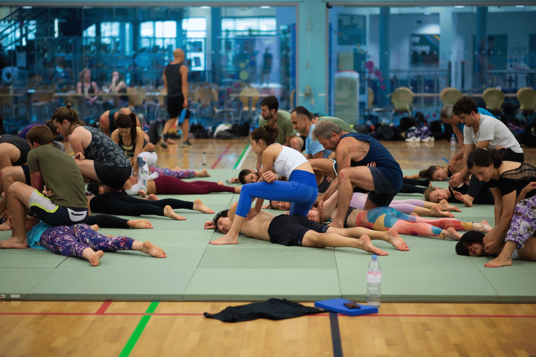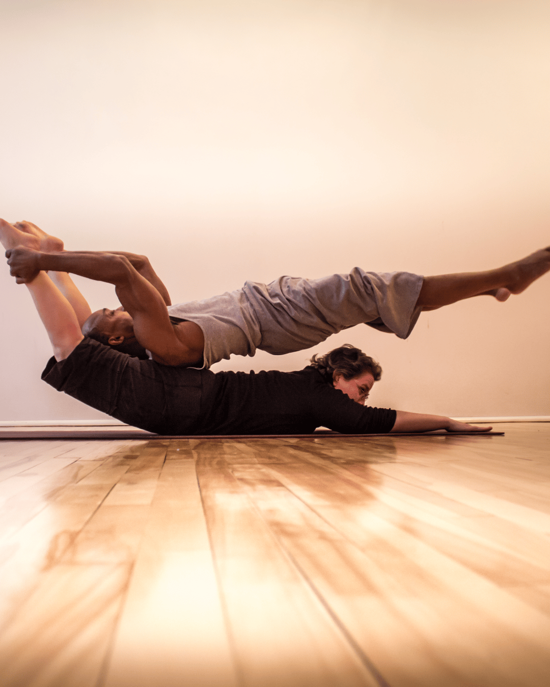 Applying Thai massage techniques in acroyoga therapeutic flying practice, to stretch, relax and feel good.